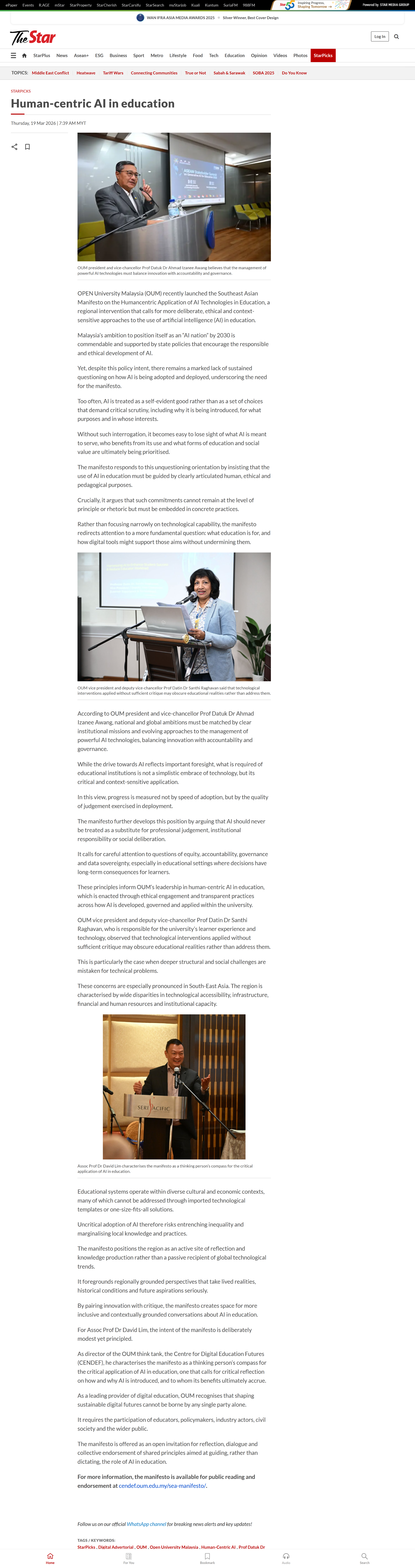 Profiled in The Star on 19 March 2026 is OUM’s “Southeast Asian Manifesto on the Human‑Centric Application of AI Technologies in Education”, which makes a case for the critical importance of AI in education (AIED) being governed by human‑centred, ethical and context‑sensitive principles rather than driven purely by technological or market imperatives.